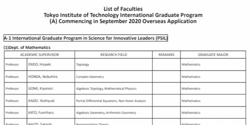 Prior to submitting the application materials to the Admissions Division, applicants must arrange for a Institute of Science Tokyo faculty member to serve as an academic supervisor. Applicants are required to communicate directly with their intended academic supervisor at Institute of Science Tokyo via email and provide a self-introductory statement and a letter of intent for their period of study at Institute of Science Tokyo, and obtain the consent of the desired faculty member to serve in this capacity.