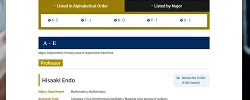 - Search your intended department's website for a Institute of Science Tokyo faculty member who could potentially be your academic supervisor. Make sure he/she is on the faculty list of your intended IGP program, then obtain his/her research information and contact details through STRDB, Institute of Science Tokyo's researcher database.