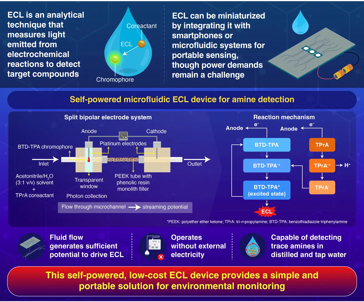 A self-powered analytical device that detects toxic amines in water using electrochemiluminescence has been developed by researchers from Japan, enabling pollutant detection without an external power source. The device operates using voltage generated by liquid flow and produces light signals to indicate contamination. This breakthrough makes water quality testing more accessible, enabling real-time, portable monitoring in situations where traditional methods are impractical.