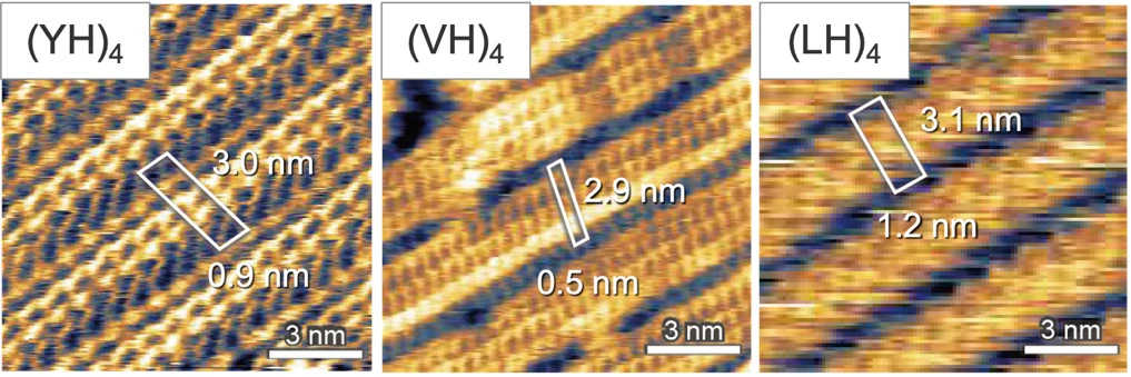 The researchers used frequency modulated atomic force microscopy to study the structures that self-assembled from droplets of (XH)4 peptide solution on a graphite electrode, where H is histidine and X is an amino acid – either Y, L or V. Their observations indicated that dipeptides self-assemble into repeating nanostructures resembling 2D crystals, with (YH)4 exhibiting the most ordered and stable configuration (Figure 2).