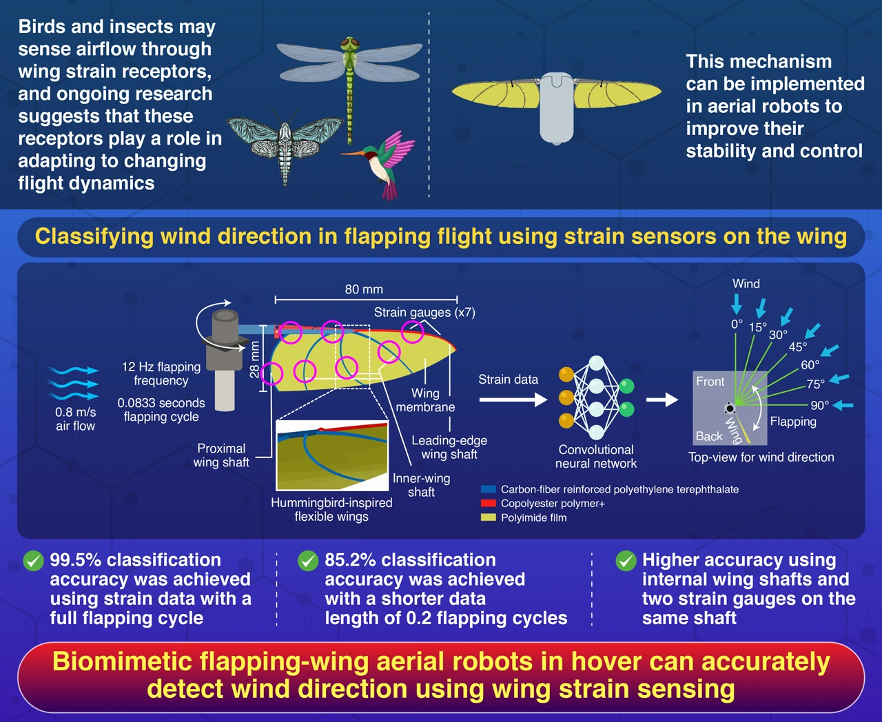 Bio-inspired wind sensing using strain sensors on flexible wings could revolutionize robotic flight control strategy. Researchers at Institute of Science Tokyo have developed a method to detect wind direction with 99% accuracy using seven strain gauges on the flapping wing and a convolutional neural network model. This breakthrough, inspired by natural strain receptors in birds and insects, opens up new possibilities for improving the control and adaptability of flapping-wing aerial robots in varying wind conditions.