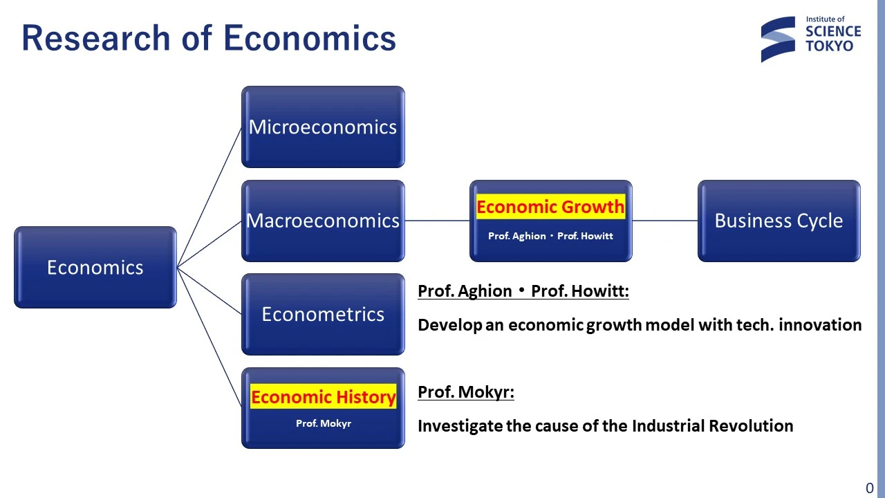 Morita  The prize recognizes their contributions to uncovering the mechanisms through which technological innovation drives economic growth. Economics is typically divided into four fields: microeconomics, macroeconomics, econometrics, and economic history. Professor Mokyr is an economic historian. He was awarded the prize for his influential research that uses historical records and new data derived from them to explain why the Industrial Revolution—history’s greatest turning point in economic growth—occurred. In contrast, Professors Aghion and Howitt specialize in economic growth theory, a subfield of macroeconomics that analyzes long-term changes in output. They were recognized for constructing models that explain how technological innovation generates sustained economic growth.