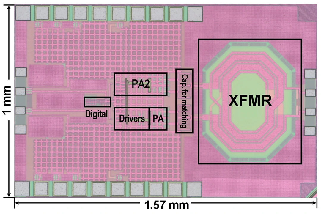In the third proposed technique, since the phase control code has only 3-bits, eight phases separated by 45° each are required. Rather than interpolating phases from 0° to 360°, by leveraging the rising and falling edges of a square wave running at four times the carrier frequency, the eight phases were generated. Multiplexing the different edges of the square wave forms the output phase. These proposed techniques ensure the linearity of both amplitude and phase modulation, eliminating power-intensive calibration procedures. The team tested their ideas by implementing the proposed digital transmitter using a 65nm CMOS process and compared its performance with other state-of-the-art designs.