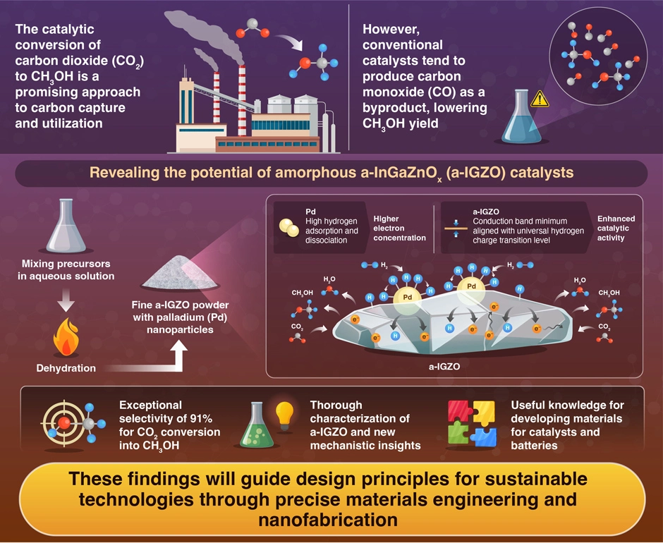 A new palladium-loaded amorphous InGaZnOx (a-IGZO) catalyst achieved over 91% selectivity when converting carbon dioxide to methanol, report researchers from Japan. Unlike traditional catalysts, this system leverages the electronic properties of semiconductors to generate all the species necessary for the conversion reaction. This study demonstrates novel design principles for sustainable catalysis based on electronic structure engineering.