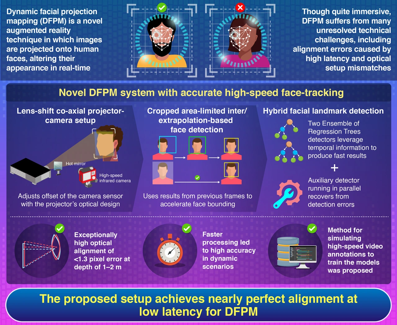 Dynamic facial projection mapping (DFPM) has reached new heights in speed and accuracy, with the development of a state-of-the-art system with groundbreaking innovations. The first breakthrough involved a hybrid detection technique combining different methods to detect facial landmarks in just 0.107 milliseconds. The researchers also proposed a way to simulate high-frame-rate video annotations to train their models and introduced a lens-shift co-axial projector-camera setup to reduce alignment errors, enabling smoother and more immersive projections.