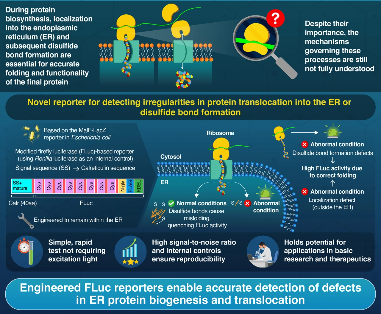 A newly developed luciferase-based reporter can detect problems in protein translocation and disulfide bond formation in the endoplasmic reticulum (ER), as reported by researchers at Science Tokyo. Inspired by natural mechanisms found in bacteria, this reporter offers a simple and robust tool for studying ER-related protein synthesis processes, with potential applications in understanding diseases and developing new treatments.