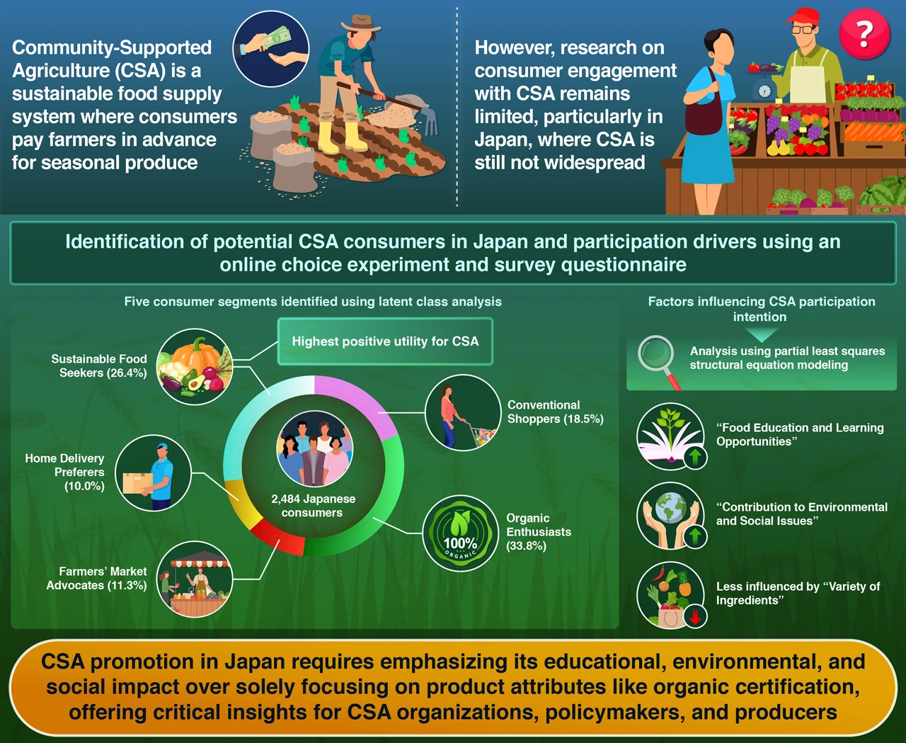 Japan has five potential consumer segments for Community-Supported Agriculture (CSA), with “Sustainable Food Seekers” showing the highest interest—as shown by scientists from Institute of Science Tokyo (Science Tokyo). Unlike other countries, “Food Education and Learning Opportunities” and “Contribution to Environmental and Social Issues” majorly influenced Japanese consumers’ intentions to participate in CSA. These findings could help CSA organizations, policymakers, and producers develop tailored strategies to promote CSA participation in Japan.