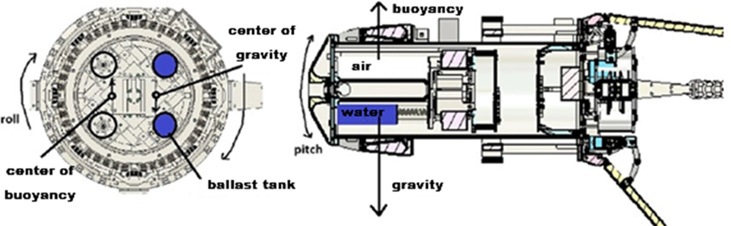 QuadKen is equipped with four ballast tanks. This allows it to control ascent and descent, as well as pitch rotation. By adjusting the positions of the center of gravity and center of buoyancy within the robot, it can also control roll rotation.