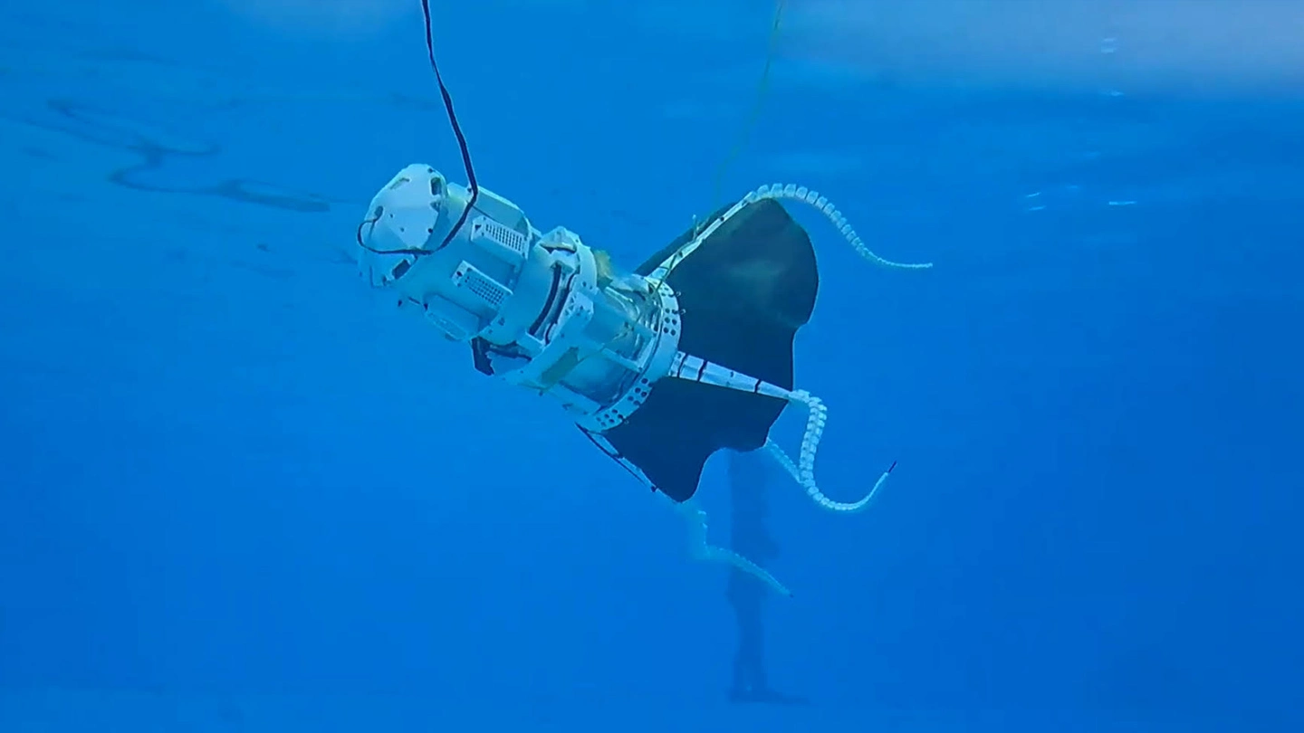 Another strength is its ability to generate propulsion by scooping water with the membrane. For instance, in environments like ponds where using thrusters is difficult due to algae or sediment, it can opt for membrane-only movement, allowing selection of the most suitable locomotion method for the environment.