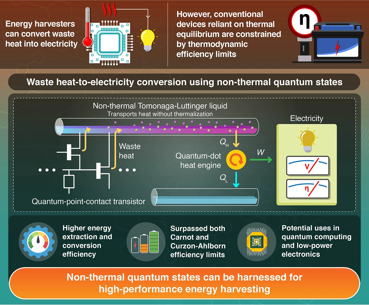 Harnessing quantum states that avoid thermalization enables energy harvesters to surpass traditional thermodynamic limits such as Carnot efficiency, report researchers from Japan. The team developed a new approach using a non-thermal Tomonaga-Luttinger liquid to convert waste heat into electricity with higher efficiency than conventional approaches. These findings pave the way for more sustainable low-power electronics and quantum computing.