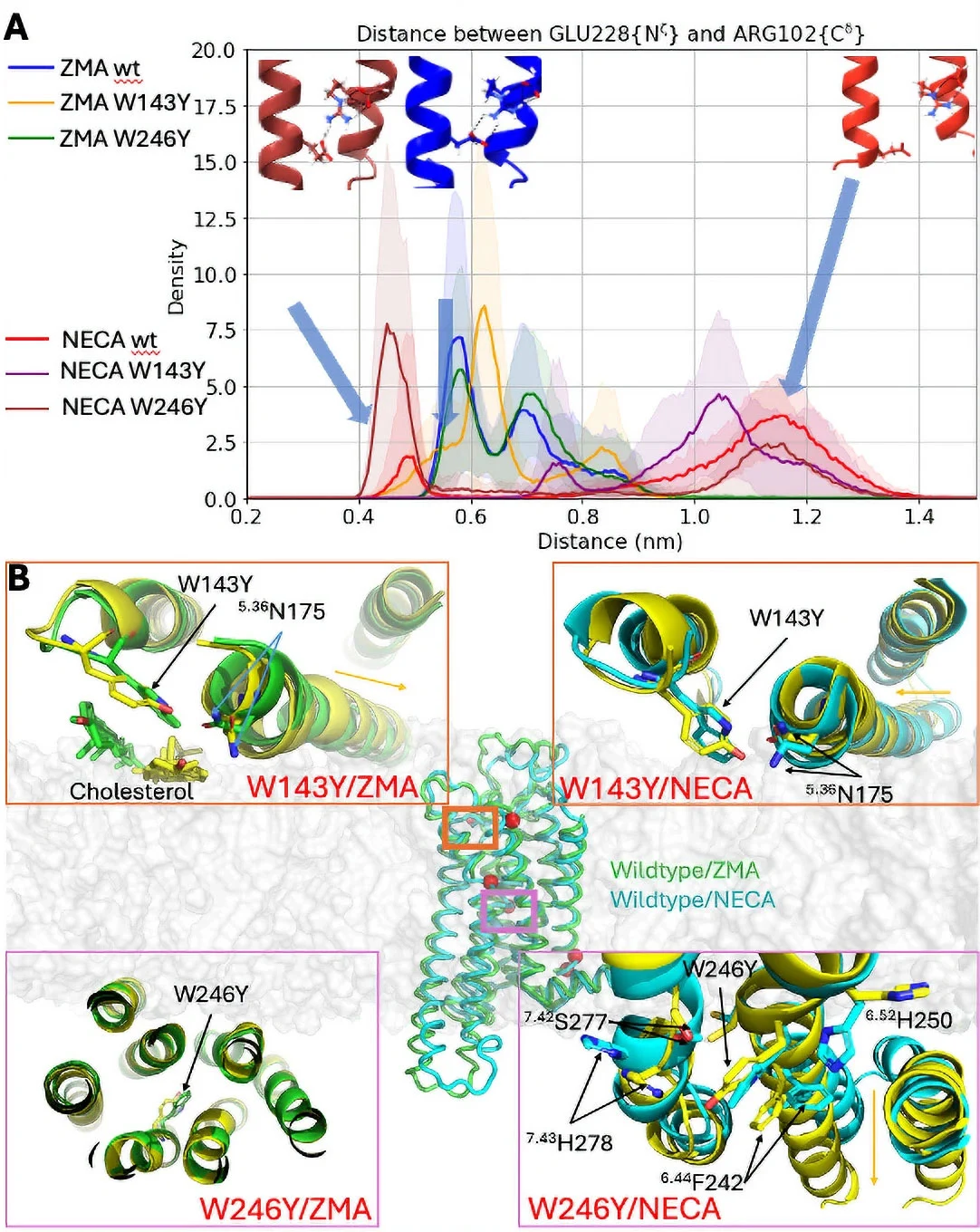 A. Distribution of the distance representing the conformational transition of a molecular micro-switch (on/off states). B. Representative structures of A2AR in complex with the agonist (NECA) and the antagonist (ZMA).