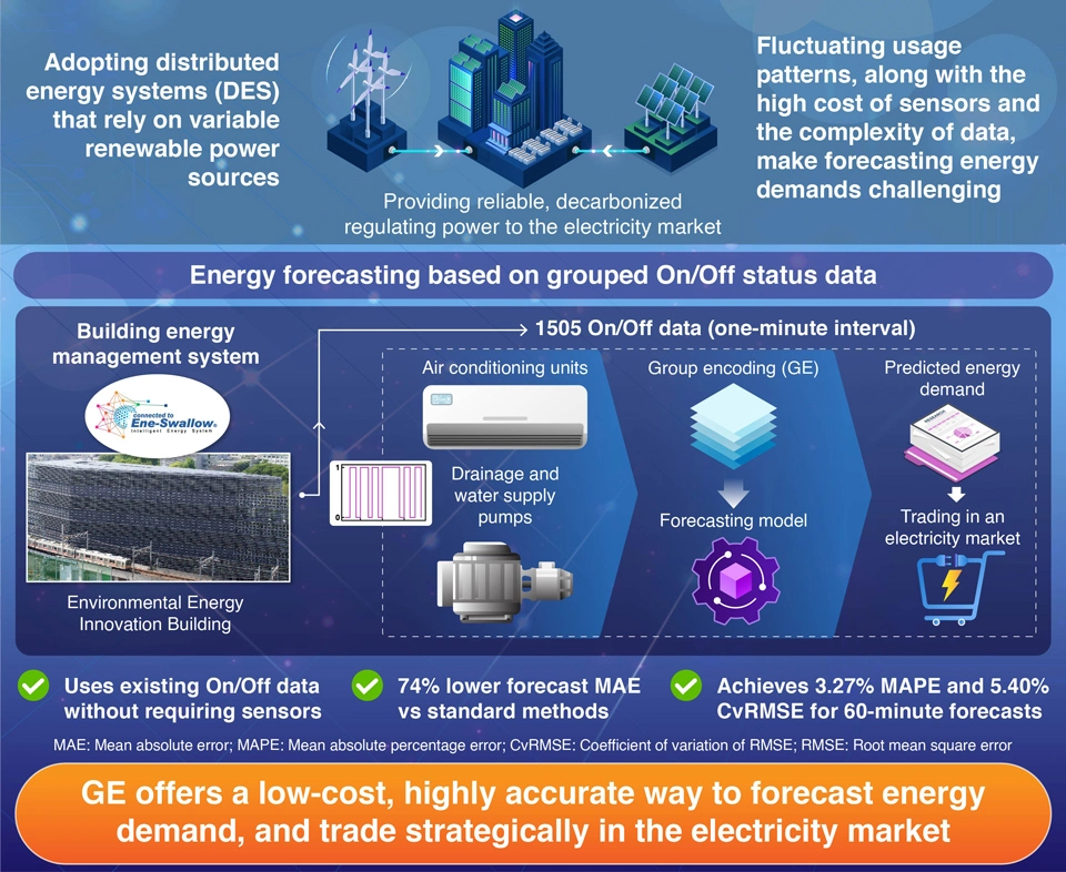 Forecasting electricity demand in buildings is now more accurate with Group Encoding (GE), a new method that uses only existing device operation data. Developed by researchers at the Institute of Science Tokyo, the method improved prediction accuracy by 74% in real-world tests. By simplifying high-dimensional binary data, GE supports efficient energy device management, cost reduction, and seamless integration of renewable energy in distributed systems, making it a practical tool for smart energy operation.