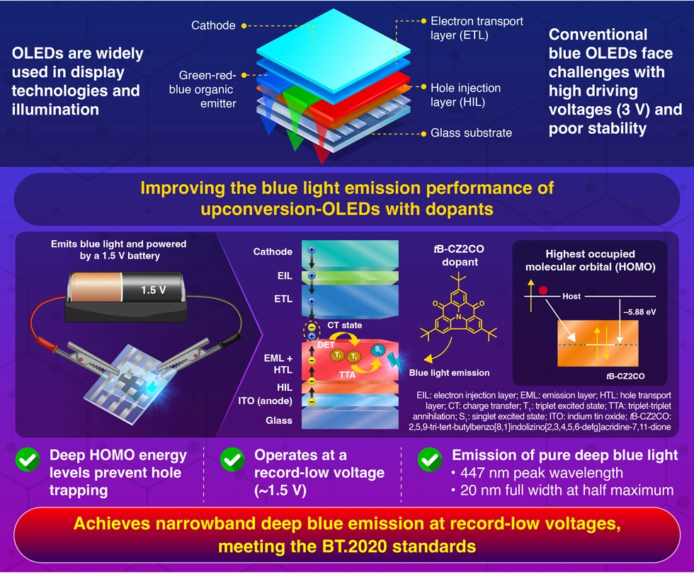 A deep blue organic light-emitting diode (OLED) developed by researchers at Science Tokyo operates on just a single 1.5 V, overcoming the high-voltage and color-purity problems that have long limited blue OLEDs. The breakthrough was achieved by introducing a new molecular dopant that prevents charge trapping, a problem that previously hampered the performance of low-voltage OLEDs. The resulting device produces sharp blue emission that meets BT.2020 standards, paving the way toward brighter, more energy-efficient displays.