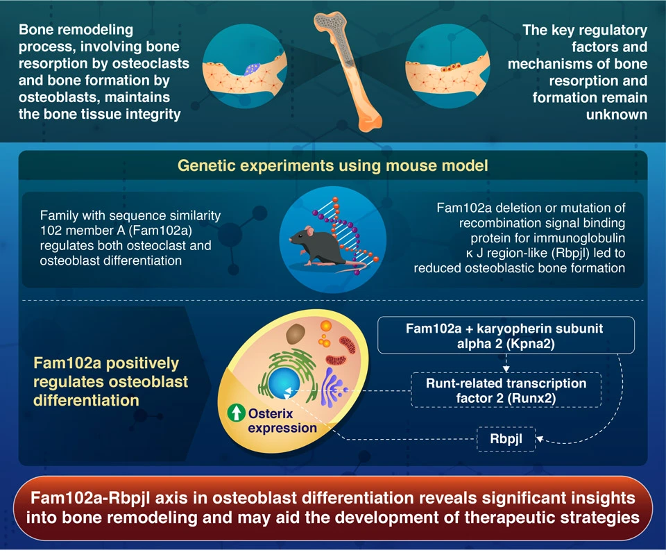 The discovery of a family with sequence similarity 102 member A (Fam102a) protein as a novel bone remodeling factor that regulates both osteoclast and osteoblast differentiation can aid the development of innovative therapeutic strategies to counter osteoporosis. Their research findings reveal the intrinsic role of Fam102a in the nuclear trafficking of key transcription factors-regulatory proteins involved in the complex bone remodeling process.
