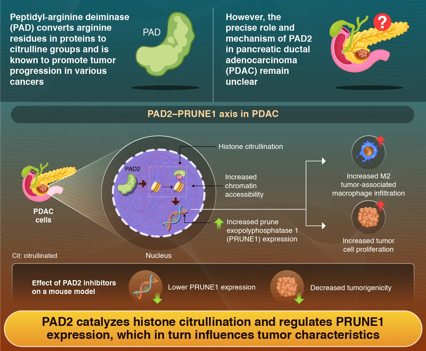 In summary, the findings reveal the critical role of PAD2 in driving tumor progression in PDAC and suggest that targeting PAD2-mediated histone citrullination could pave the way for the development of epigenetic therapies.