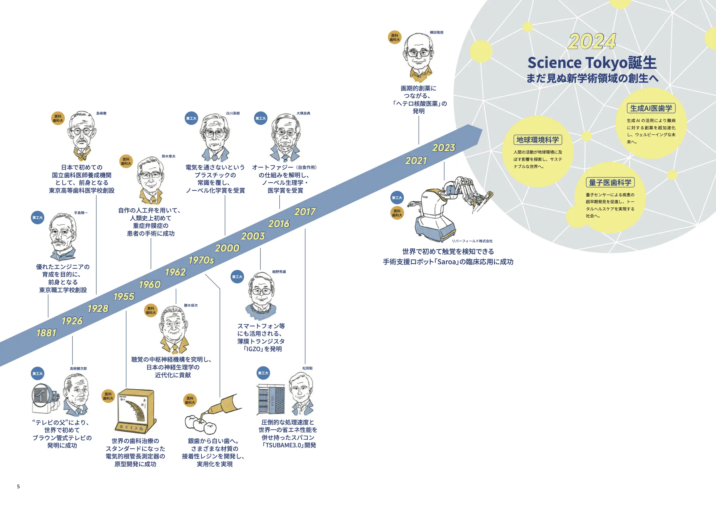 これまで両大学は、世界を変えるさまざまな研究成果を残してきました。東京科学大学への入学は、こうした科学の連綿と続く営みに参加することを意味します。統合により生まれる、新たな科学の可能性をともに追求しましょう。