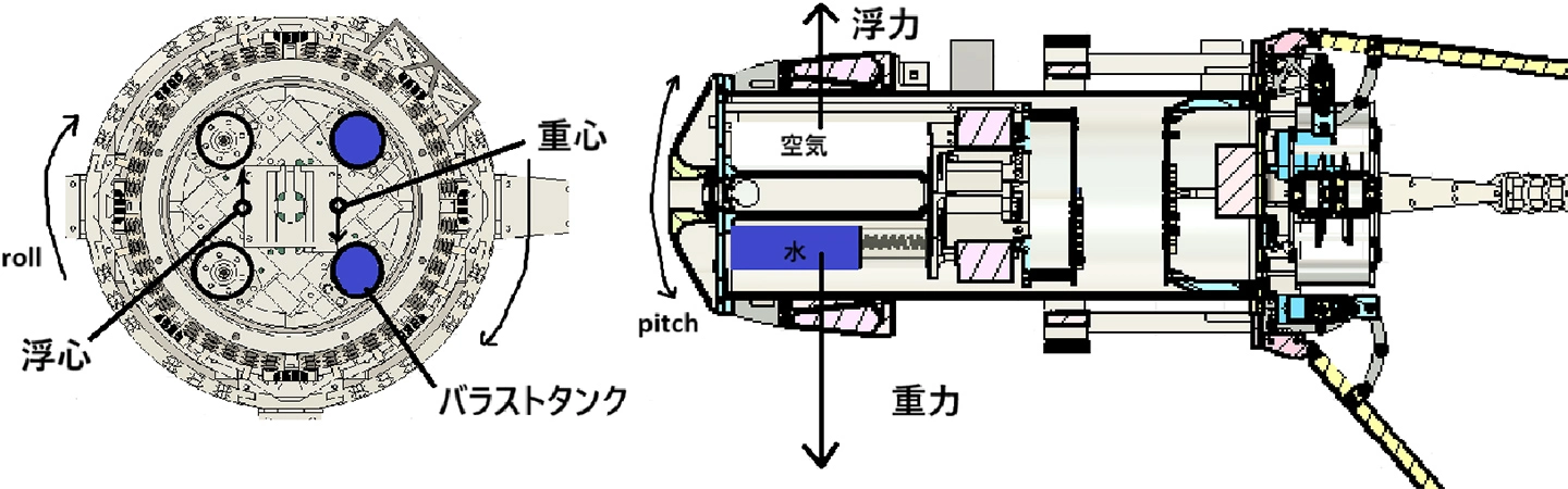 バラストタンクとは、外部の水を機体に取り込むことで浮力を調整する装置で、浮力を利用するため、スラスタに比べて下方向や上方向の運動を効率的に行えるのが特徴です。